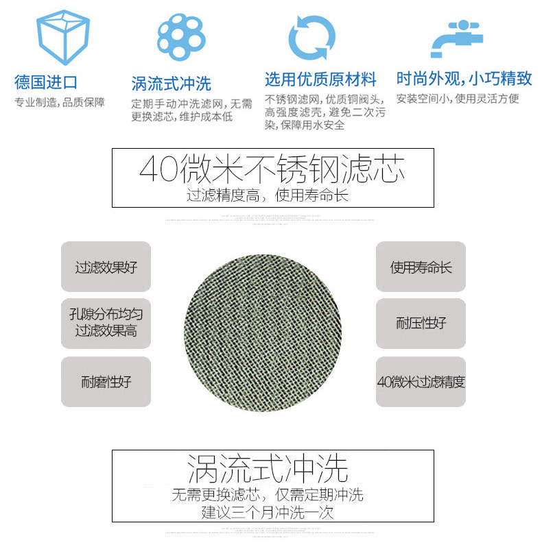 ● 渦流式?jīng)_洗,終身免換芯 ● 40微米過(guò)濾,能有效過(guò)濾雜質(zhì)、泥沙、鐵銹、蟲卵 ">